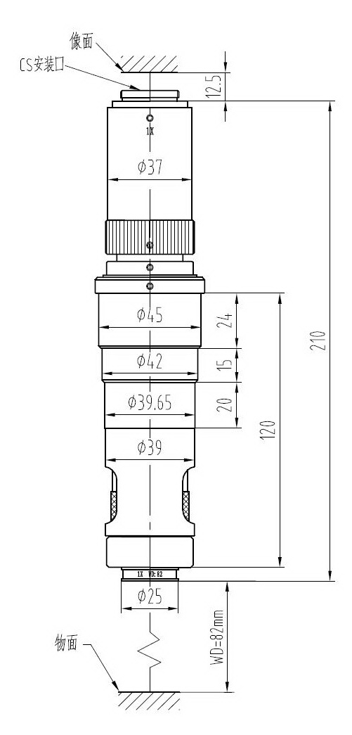 安裝尺寸:Φ45mm 最大兼容相機:1/2" CCD螺紋接口:1英吋32扣